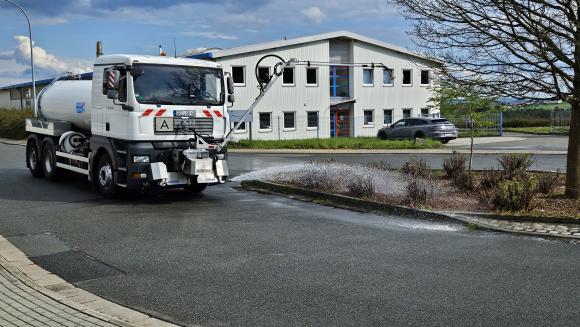 Effiziente Bewässerung für Kommunen durch einen Straßenwaschwagen – Klimaanpassung praktisch umgesetzt.